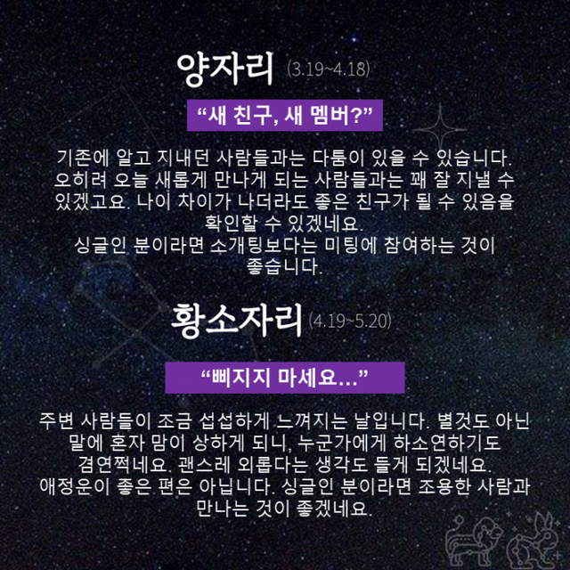 기존에 알고 지내던 사람들과는 다툼이 있을 수 있습니다. 오히려 오늘 새롭게 만나게 되는 사람들과는 꽤 잘 지낼 수 있겠고요. 나이 차이가 나더라도 좋은 친구가 될 수 있음을 확인할 수 있겠네요.