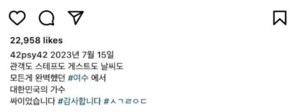 싸이는 지난 15일 전남 여수 진남종합운동장에서 '싸이 흠뻑쇼 SUMMER SWAG 2023'를 진행했다. 공연을 마친 싸이는 다음날인 16일 인스타그램을 통해 "관객도 스태프도 게스트도 날씨도 모든 게 완벽했던 여수에서 대한민국의 가수 싸이였습니다"라는 문구와 함께 감사 인사를 남겼다.