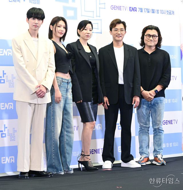 배우 전혜진, 최수영, 안재욱, 박성훈, 이민우 감독이 17일 오전 서울 상암동 스탠포드 호텔에서 열린 지니 TV 오리지널 '남남' 제작발표회에 참석해 포토타임을 갖고 있다.