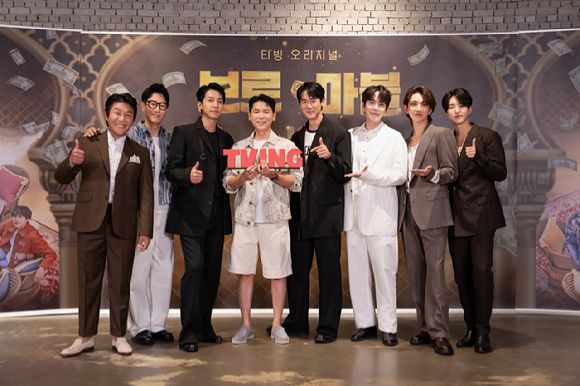코미디언 조세호, 지석진, 가수 겸 배우 이승기, 이홍희 PD, 배우 유연석, 그룹 슈퍼주니어 규현, 세븐틴 조슈아, 호시가 17일 온라인으로 진행된 티빙 오리지널 예능 '브로 앤 마블' 제작발표회에 참석해 포즈를 취하고 있다. [사진=티빙]
