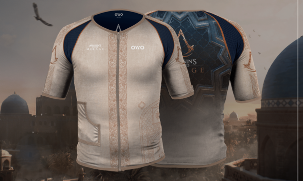OWO가 공개한 자사의 햅틱 게이밍 시스템 ‘어쌔신 크리드 미라지’ 에디션은 신작의 게임플레이에 대응해 다양한 반응을 착용자에게 제공하는 형태로 꾸며졌다.