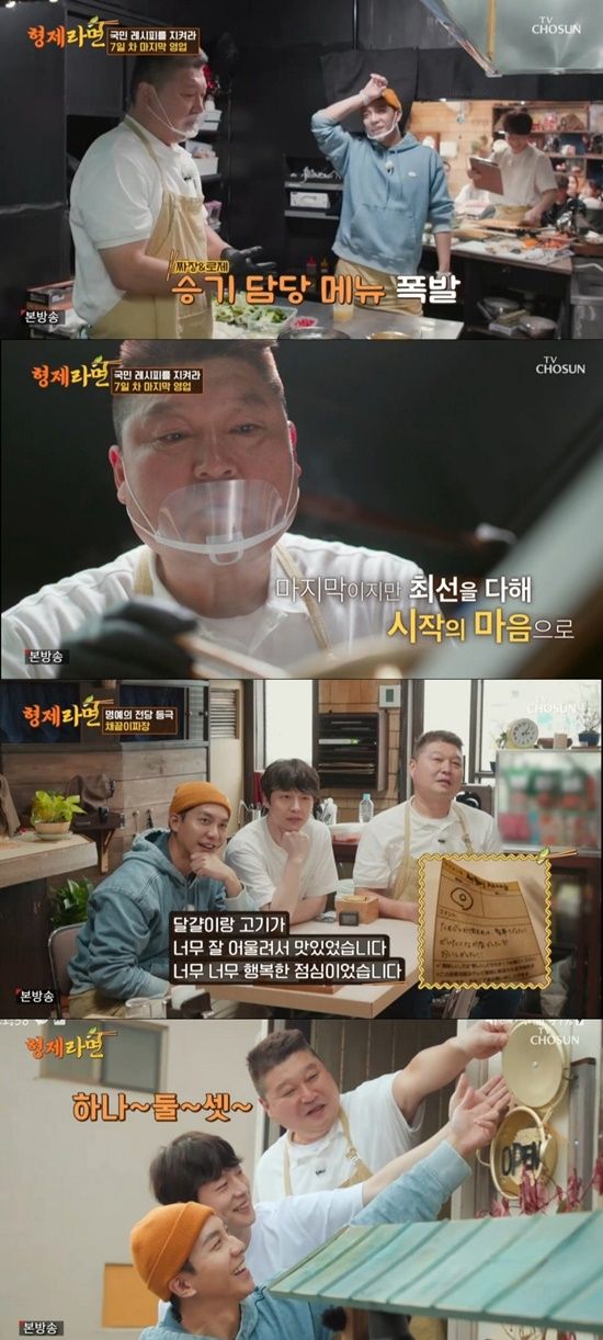 마지막 방송에서는 강호동과 이승기, 배인혁이 7일 차 영업까지 한국 라면을 알리기 위해 고군분투하는 모습과 더불어 마지막 레시피 투표에서 채끝이짜장이 살아남아 '명예의 전당'에 오르는 모습이 담겼다.