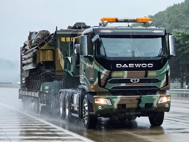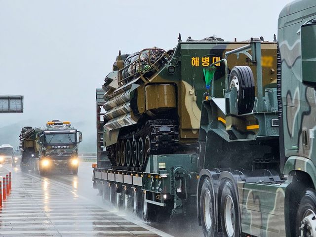 18일 해병대는 대형 트럭에 실려 폭우 피해 현장으로 가는 한국형 상륙돌격장갑차 사진을 공개했다.