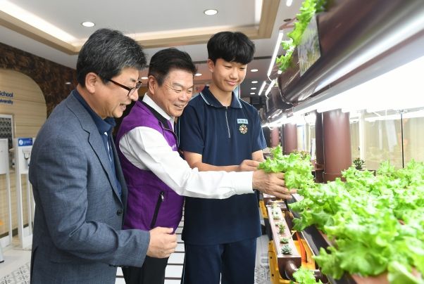 | ▲ 동대문구(구청장 이필형)는 지난 17일 미래인재 양성을 위한 스마트 교육의 일환으로 동국대학교사범대학부속중학교(이하 동대부중)에서 운영된 ‘스마트 팜’ 교육에 이필형 동대문구청장이 직접 참여했다고 밝혔다. |