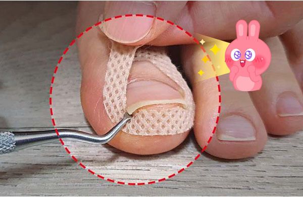 발톱 보조기를 사용하면 더 쉽고 정확하게 붙일 수 있다. 발톱 보조기는 살에 파고든 발톱을 들어 밴드를 좀 더 밀착시켜 붙일 수 있도록 도와주는 기구다. (추가 구매 가능)