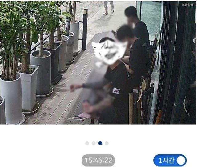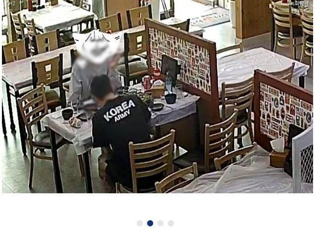 A씨가 공개한 CCTV 사진에는 ‘Korea army’라는 문구가 적힌 검은 티셔츠를 입은 남성들이 횟집에서 식사를 하는 모습, 식당 밖에서 문신을 한 남성이 담배를 피는 모습 등이 담겼다.