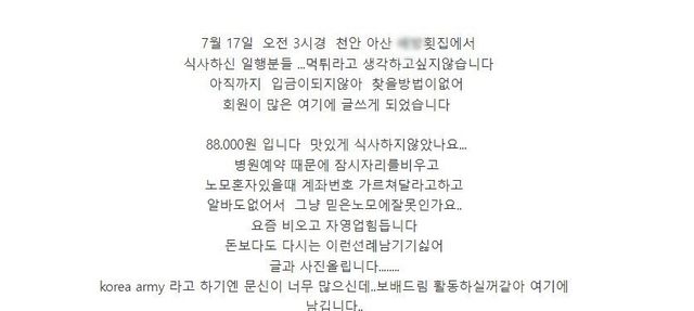 A씨는 “8만 8000원이다. 맛있게 식사하지 않았냐. 병원 예약 때문에 잠시 자리를 비우고 노모 혼자 있을 때 ‘계좌번호를 가르쳐달라’한 뒤 그냥 가셨다. 요즘 비 오고 자영업 힘들다. 돈보다는 이런 선례를 남기기 싫어 글과 사진을 올린다. ‘Korea army’라고 하기에는 문신이 너무 많으시다”며 ‘먹튀’를 당한 사연을 밝혔다.