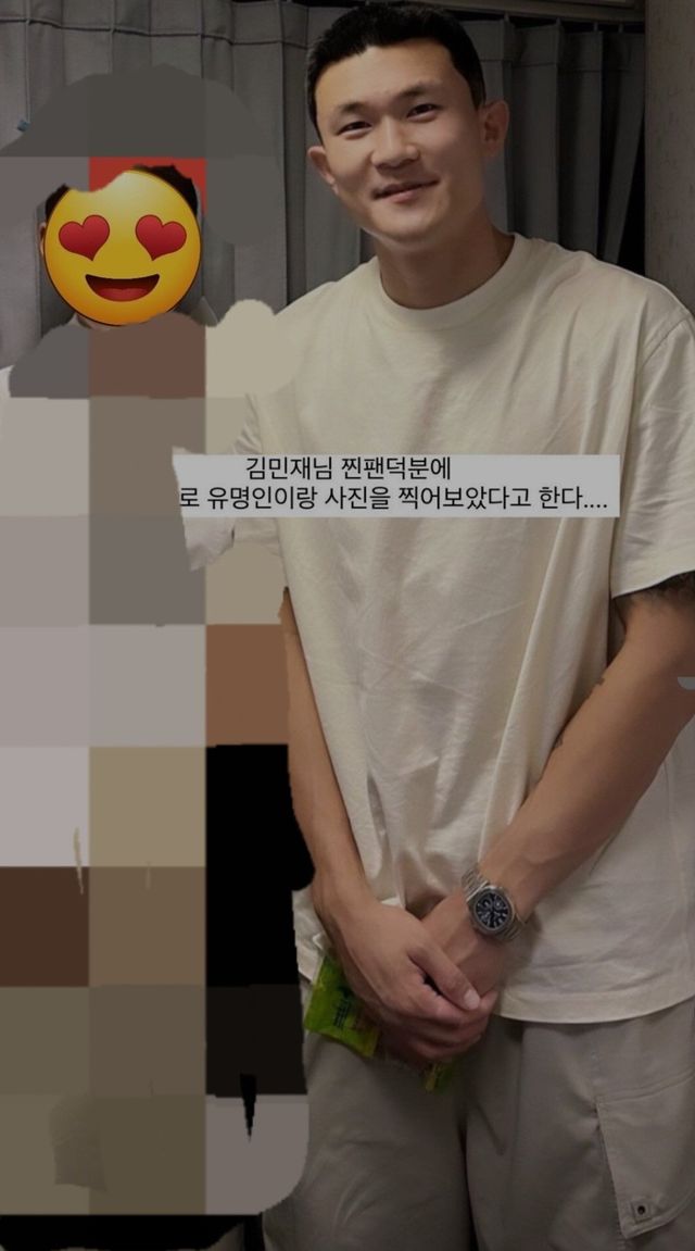 글쓴이 A씨는 "와이프가 (대한항공) 승무원인데 내가 김민재 좋아하는 거 알아서 (와이프가) 기내에서 같이 사진을 찍었다"며 투샷 사진을 공개했다.