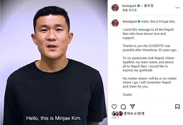 이적이 임박한 상황에서 김민재는 “사랑과 응원을 보내주신 나폴리 팬 여러분께 이 메시지를 보낸다. 팬들 덕분에 33년 전 디에고 마라도나 시절 이후 처음으로 스쿠데토 우승이 가능했다. 열정적인 구단, 루치아노 스팔레티 전 감독, 팀 동료들, 무엇보다 나폴리 팬들에게 감사한 마음을 전한다. 내가 어디에 있든, 어디로 가든 나폴리를 기억하고, 응원하겠다. 감사하다”고 하며 나폴리 팬들에게 ‘굿바이’ 작별인사를 전했다.
