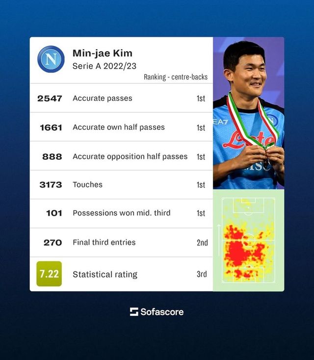 나폴리로 이적하며 빅리그에 진출했다. 첼시로 간 칼리두 쿨리발리 대체자였다. 활약은 쿨리발리 그 이상이었다. 기록으로 봐도 최고였다. 축구통계매체 ‘소파 스코어’에 따르면 김민재는 세리에A 센터백 중에서 정확한 패스 횟수(2,547개), 자기 진영 내 정확한 패스 회수(1,661회), 반대 진영에서 정확한 패스 횟수(888회), 터치(3,173회) 모두 1위였다. 파이널 서드 진입(101회)은 2위였다.