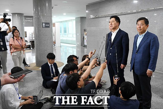 토론회 직후 취재진의 질문에 답하는 김 대표(가운데).
