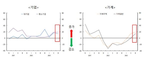 3분기 중소기업과 가계의 신용위험 전망치는 36으로 2분기(33)보다 올라갔다. 대기업의 신용위험 전망치는 14로 낮다.