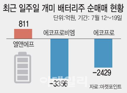 연초 10만원대에서 거래되던 에코프로가 10배 올라 고점에 달했다는 인식이 퍼지자 일부 투자자들이 차익 실현에 나서면서 저평가된 엘앤에프에 눈을 돌리기 시작한 것으로 분석된다. 실제 2차전지주 매수에 주력하던 개인들의 투자 전략에서 변화가 감지되고 있다. 최근 일주일간(7월12일~19일) 코스닥 시장에서 개인투자자 순매수 1위 종목은 엘앤에프가 차지했다. 811억원을 순매수한 것으로 집계됐다. 이와 달리 에코프로비엠(247540)과 에코프로는 순매도 1위, 2위 종목에 올랐다. 개인투자자는 에코프로비엠을 3356억원, 에코프로를 2429억원 각각 순매도했다. 외국인들 역시 엘앤에프 비중을 늘리고 있다. 일주일간 외국인은 272억원 순매수한 것으로 집계됐다.