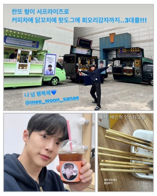 지난 18일 배인혁 공식 계정에는 "찬또 형이 서프라이즈로 커피차에 닭꼬치에 핫도그에 회오리감자까지 세대를!!! 나 넘 행복해"라는 글과 함께 3장의 사진이 게재됐다.