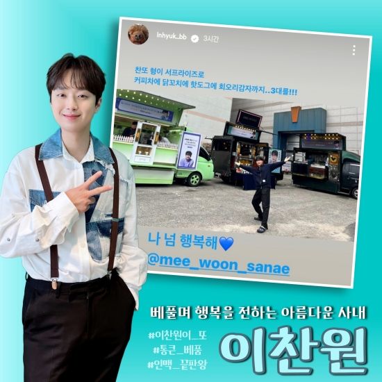 (엑스포츠뉴스 이정범 기자) '찬또배기' 이찬원이 배인혁의 '열녀박씨 계약결혼뎐' 촬영장에 간식차를 3대 선물했다.