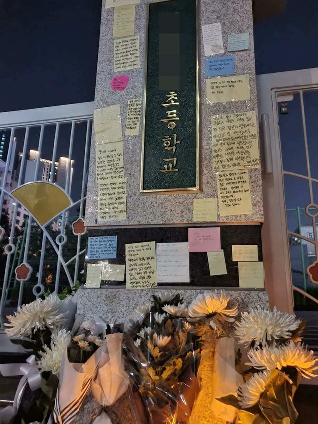 사건이 벌어진 해당 초등학교 앞 근조화환이 놓인 모습 / 이하 온라인 커뮤니티 '루리웹'
