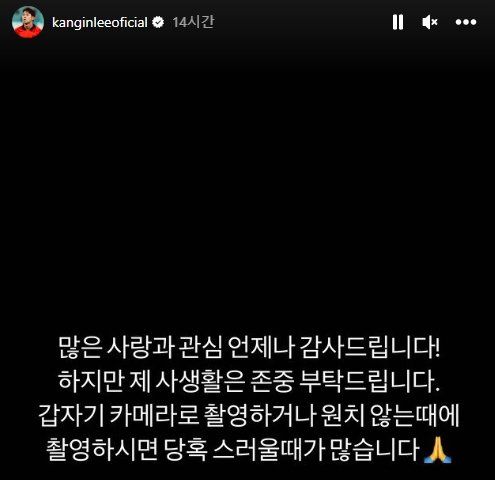 이강인은 19일(이하 한국시각) 자신의 인스타그램에 "많은 사랑과 관심 언제나 감사드립니다. 하지만 제 사생활은 존중 부탁드립니다"고 전했다.