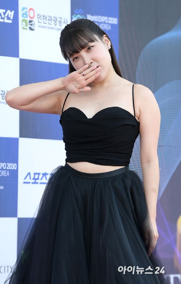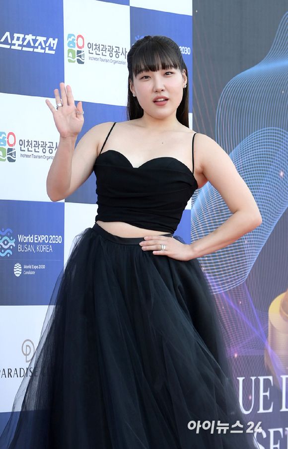 '투피스 드레스 어울리죠?' 코미디언 이은지가 19일 인천 파라다이스시티에서 열린 제2회 청룡시리즈어워즈 레드카펫 행사에 참석하고 있다. [사진=정소희 기자]