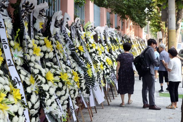 20일 오전 서울 서초구의 한 초등학교 앞에 근조 화환이 놓여져 있다. (사진=뉴시스)