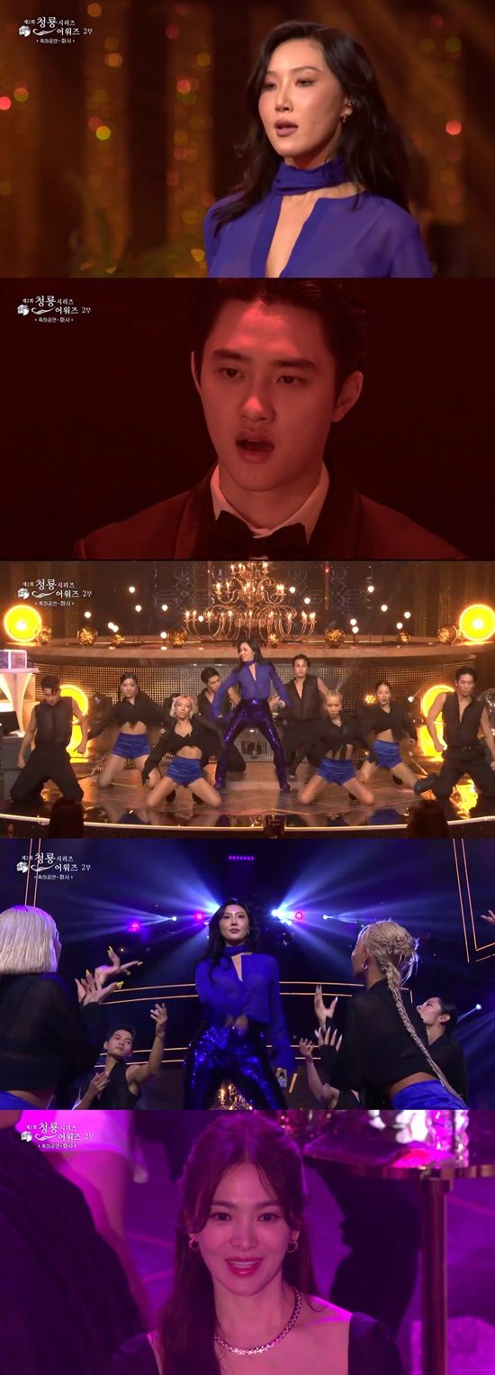 화사의 무대를 지켜보는 수많은 연예인들도 크게 호응하며 현장 분위기를 뜨겁게 달궜다. 디오는 입을 다물지 못한 채 화사의 무대를 지켜보는 모습이 화면에 잡혀 화제를 모으기도. 여기에 송혜교의 흐뭇한 미소까지 포착되어 관심을 집중시켰다.