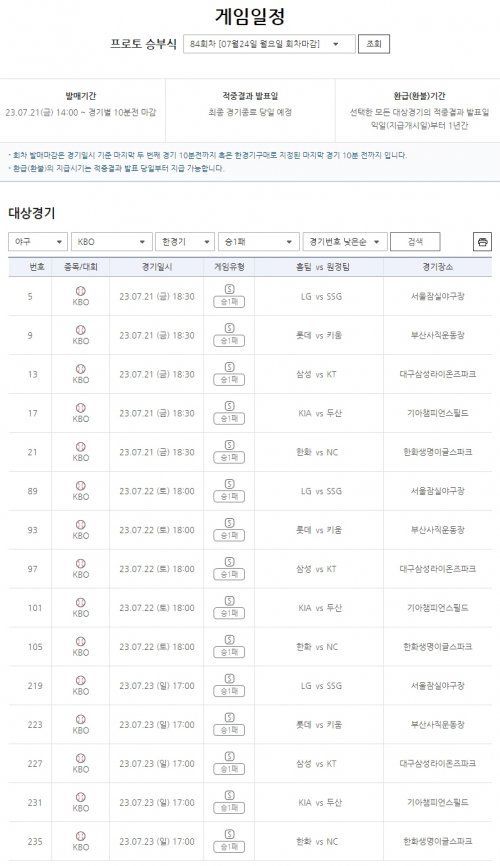 21일(금) 오후 2시부터 발매를 개시하는 프로토 승부식 84회차 중 ‘야구 승1패’ 유형은 국내프로야구(KBO리그) 경기만을 대상으로 하며, 추후 미국프로야구 메이저리그(MLB) 등을 추가하는 등 대상경기를 더욱 확대해갈 계획이다.