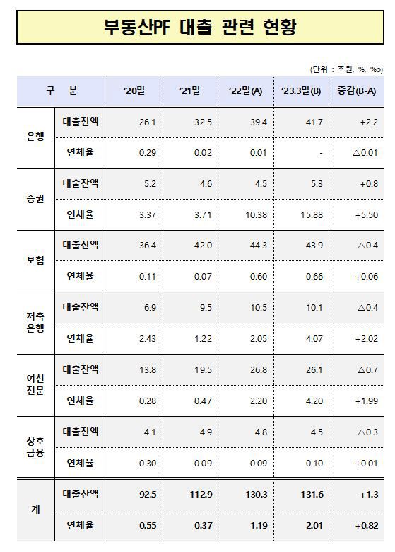 전체 금융권의 PF 대출 잔액은 올해 3월 말 131조6000억원에 달했다. 2021년 말(112조6000억원)보다 1년여 만에 19조원 증가했다. 금융권의 부동산 PF 대출잔액은 2020년 말까지 100조원을 밑돌았는데 이후로는 매년 급증하는 추세다. 같은 기간에 연체율도 0.37%에서 2.01%로 증가했다.