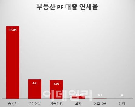 증권사의 PF 연체율은 부동산 경기가 호조세를 보였던 2019년 말에는 1.3% 수준이었다. 하지만 부동산 경기가 둔화하면서 2020년 말에는 3.37%, 2021년 말에는 3.71%였다가 작년 말에는 10.38%로 높아졌다. 이어 올해는 1분기 말에 15%대로 급등한 것이다.
