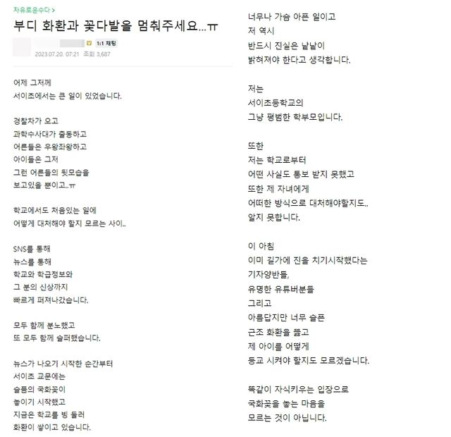 서초구의 한 맘카페 회원 A씨는 20일 오전 자신을 서이초등학교의 평범한 학부모라고 주장하며 '부디 화환과 꽃다발을 멈춰 주세요'라는 제목의 글을 게재했다.