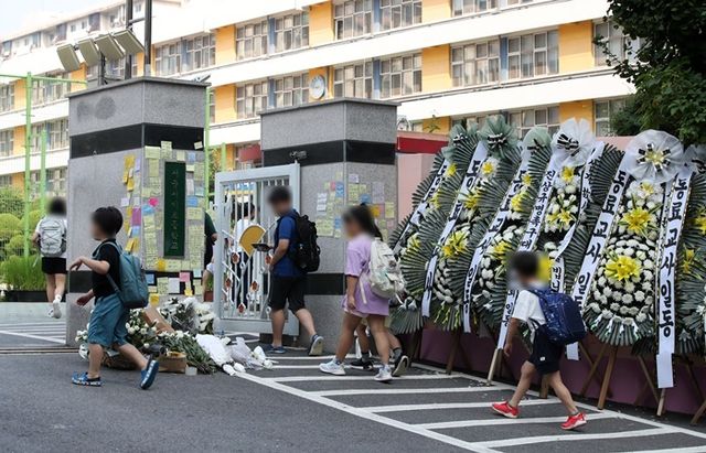 극단적 선택을 한 교사를 추모하기 위해 서울 서초구 서이초등학교 앞에 도착한 근조화환 / 뉴스1