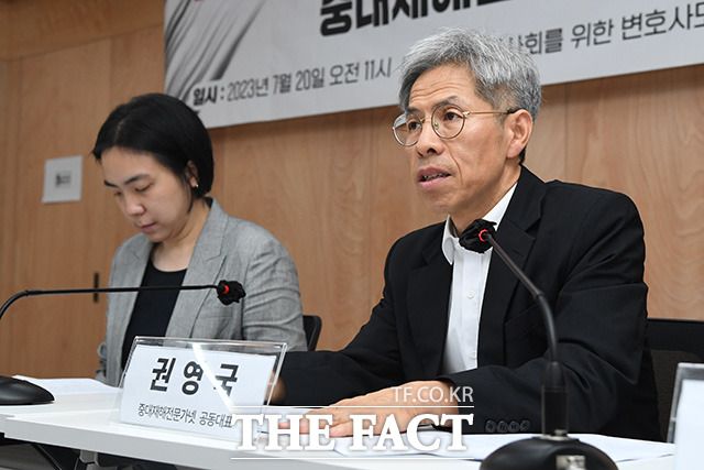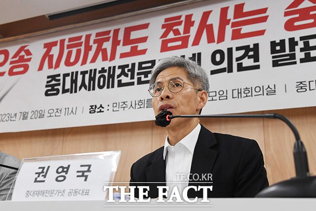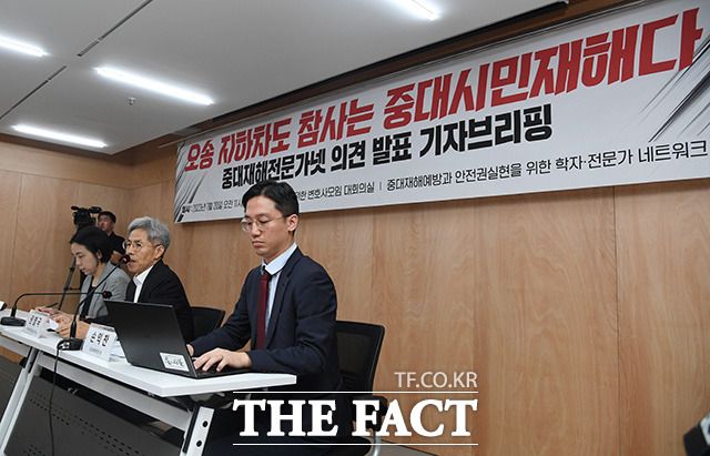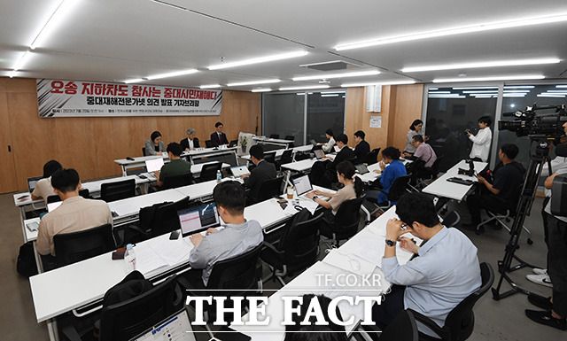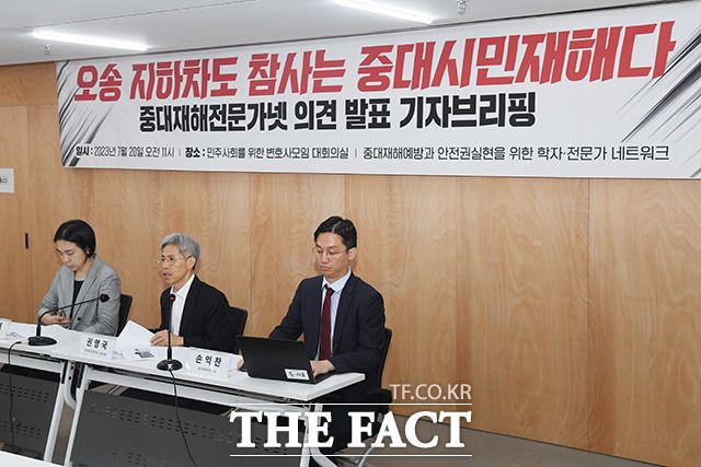 [더팩트ㅣ장윤석 인턴기자] 시민단체 중대재해 예방과 안전권 실현을 위한 학자․전문가 네트워크(중대재해전문가넷)가 20일 오전 서울 서초구 민주사회를위한변호사모임 대회의실에서 '오송 지하차도 참사는 중대 시민 재해다' 의견 발표 기자브리핑을 열고 개선을 촉구하고 있다.