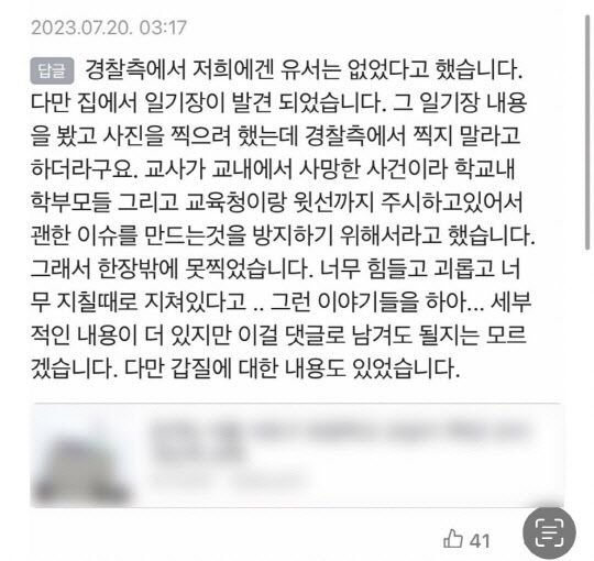 이어 “집에서 일기장이 발견되고 그 내용을 보고 사진을 찍으려 했는데 경찰 측에서 ‘찍지 말라’고 하더라”며 “경찰이 ‘교사가 교내에서 사망한 사건이라 학부모들, 교육청이랑 윗선까지 주시하고 있어 괜한 이슈를 만드는 것을 방지하기 위해서’라고 해 한 장밖에 찍지 못했다”고 주장했다.