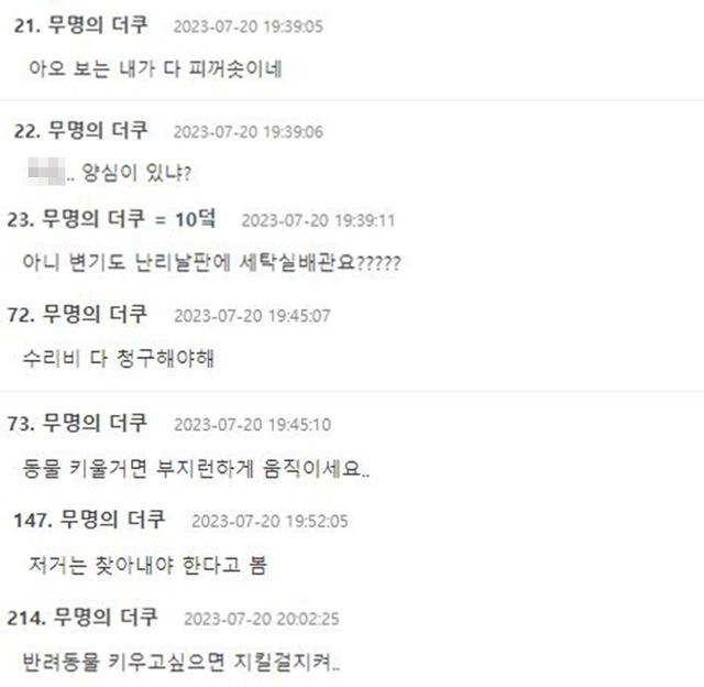 누리꾼들은 온라인 커뮤니티 '더쿠' 등에 "보는 내가 피가 거꾸로 솟는다", "양심이 있는 거냐", "아니 변기도 아니고 세탁실 배관이요?", "수리비 다 청구해야 한다", "반려동물 키울 거면 부지런하게 움직이세요", "찾아내야 한다", "반려동물 키울 거면 지킬 건 지켜야지" 등 댓글을 남겼다.