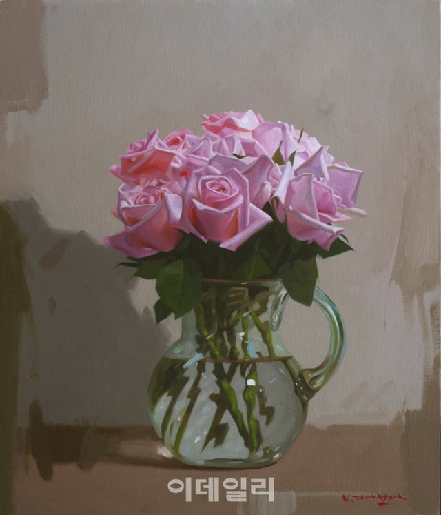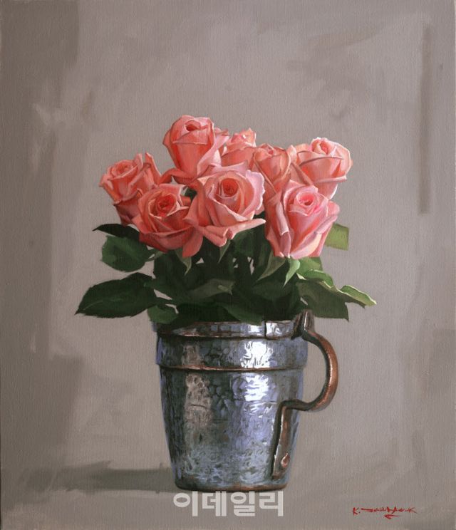 [이데일리 오현주 문화전문기자] 무릇 ‘그림’이라고 할 때 떠올릴 장면이 아닌가. 낯익은 정물이 군더더기 없이 제자리에 놓였고, 마치 그게 세상의 전부인 양 세세하게 ‘기록’한 화면. 가령 은제화병에 꽂힌 한무더기의 분홍장미가 내뿜는 절정의 생명력을 캔버스에 그대로 심어낸 저 그림이 말이다. 하지만 그러거나 말거나, 화가는 있는 듯 없는 듯 애써 무심한 붓터치로 일관해내고.