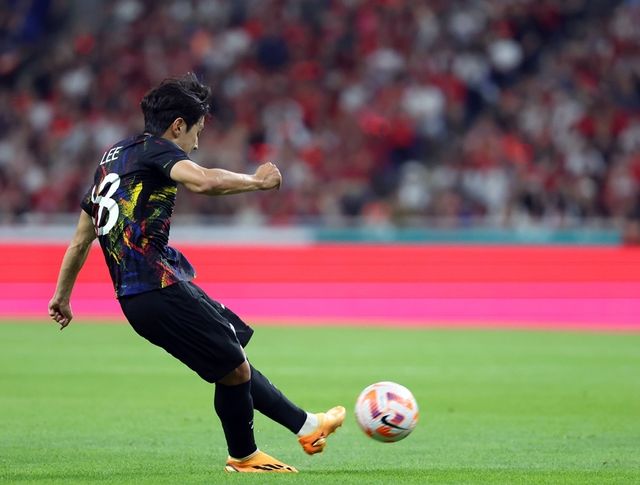 이강인이 지난달 16일 부산시 연제구 부산아시아드주경기장에서 열린 하나은행 초청 대한민국과 페루의 축구 국가대표 평가전에서 프리킥을 차고 있다.