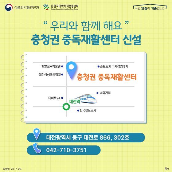 식품의약품안전처는 마약류 중독자에 중독회복관리·재활교육 프로그램 등을 제공하는 식약처 산하 한국마약퇴치운동본부 부설 충청권 마약류 중독재활센터를 대전 동구에 개소했다고 밝혔다.