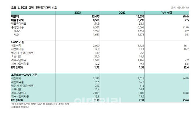 IBM은 2분기 매출액이 155억달러를 기록, 지난해 같은 기간보다 0.4% 감소했다. 이는 시장 예상치를 약 1억1000만달러 하회하는 수준이다. 다만 긍정적인 점은 IBM이 전략적으로 시장 확대에 집중하고 있는 소프트웨어 매출이 66억달러로 7.2% 증가한 점이다. 이는 기존 기대치(64억달러)를 상회하는 규모다.