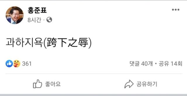 홍 시장도 윤리위의 징계 개시 의결 이후 ‘과하지욕(跨下之辱)’이라는 사자성어를 자신의 SNS에 게재했습니다. 과하지욕은 ‘가랑이 밑을 기어가는 치욕을 참는다’는 뜻이죠. 사과까지 한 마당에 윤리위의 징계 절차 개시 결정을 인정할 수는 없지만 일을 더 크게 키우지 않겠다는 뜻으로 풀이되는데요. 비판이 쏟아지자 홍 시장은 해당 게시물을 8시간 만에 삭제했습니다.