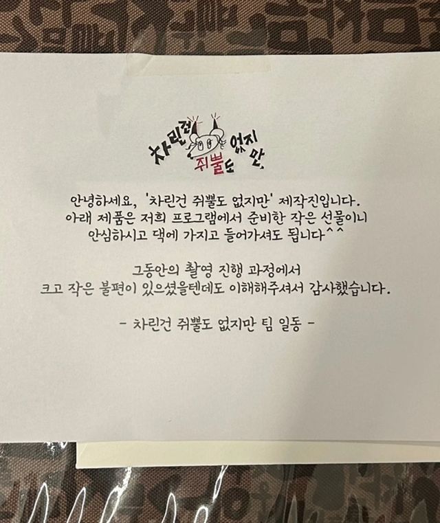'차쥐뿔' 제작진은 갈비 세트를 준비하며 "그동안 촬영 진행 과정에서 크고 작은 불편이 있으셨을 텐데도 이해해 주셔서 감사했다"고 고개를 숙였다.