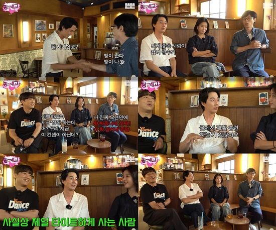 가장 먼저 카페에 도착한 조인성은 차태현과의 찐친 케미는 물론 유재석과의 티키타카로 시작부터 예능감을 발휘했다. 8월초 공개 예정인 '무빙'에 관한 이야기를 나누던 중 "갖고 싶은 초능력이 있냐"는 유재석의 질문에 그는 "이런 거 너무 진부하다"며 짓궂게 놀렸다.