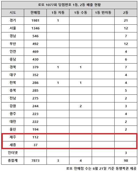 동행복권이 22일 추첨한 로또 1077회 당첨번호 조회 결과 1등은 7명(또는 6명), 2등은 98게임이다. 전국 17개 시도 중 제주, 세종 지역에서는 로또 고액(1,2등) 당첨 판매점이 단 한 곳도 나오지 않았다.