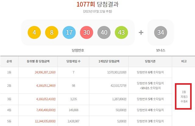 1077회 로또 1등 중 3명이 자동으로 구매, 행운의 목돈을 거머쥔다. 나머지 4명(또는 3명)은 수동으로 1077회 로또 당첨번호 6개를 다 맞히는 기염을 토했다.