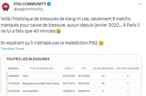 최근 3년 넘게 부상을 입은 적이 없던 이강인이 PSG에 오자마자 허벅지 통증을 호소하는 모습에 그들은 "이강인이 PSG 저주에 걸리지 않기를 바란다"라며 빠른 회복을 기원했다.