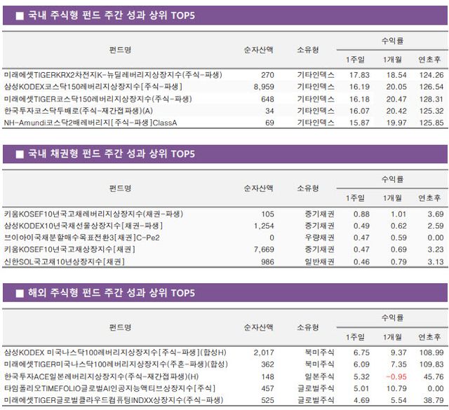 23일 펀드평가사 KG제로인에 따르면 순자산액(클래스 합산) 100억원 이상, 운용기간 1개월 이상인 국내 주식형 펀드 중 주간 수익률(7월 14~20일) ‘TIGERKRX2차전지K-뉴딜레버리지’ 상장지수펀드(ETF)는 17.83%로 1위를 기록했다. 이어 ‘KODEX코스닥150레버리지’ ETF가 16.19%, ‘한국투자코스닥두배로’가 16.07%로 뒤를 이었다.