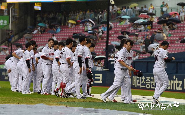 관중석에서는 형형색색의 우산이 하나 둘 등장했고, 그라운드에는 방수포가 깔렸다. 시간이 지나도 좀처럼 빗줄기가 가늘어지지 않자 결국 심판진은 오후 6시 20분 우천취소를 결정했다. 전광판에 해당 내용이 송출되는 순간 양 팀 관중석에서는 탄식이 쏟아졌다. 선수들이 관중석에 인사를 한 뒤에는 LG 송찬의, 이주형, 문성주, 오스틴 딘이 그라운드에서 우천 세레머니를 선보이며 팬들의 아쉬움을 달랬다.