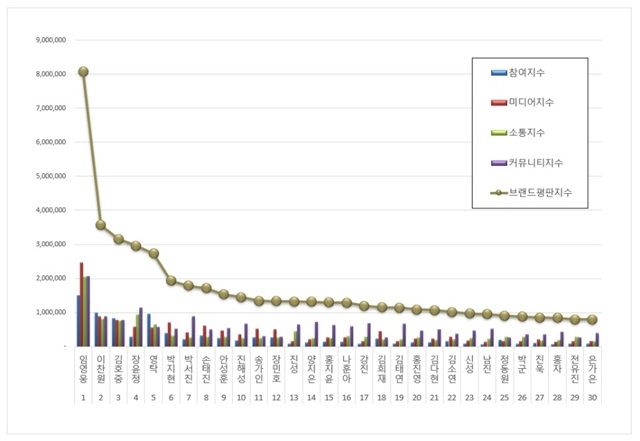 7월 임영웅 브랜드는 참여지수 150만 5338, 미디어지수 246만 7131, 소통지수 204만 2324 커뮤니티지수 206만 4451이 되면서 브랜드평판지수 807만 9244로 분석됐다. 지난 6월 브랜드평판지수 1001만 8257과 비교하면 19.35% 하락했다.