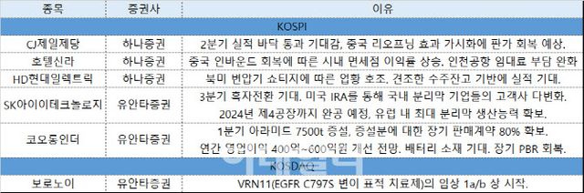 하나증권은 CJ제일제당(097950)을 추천주로 제시했다. 올 2분기를 기점으로 실적 바닥 통과 기대감이 나온다. 해외는 ‘슈완즈’ 채널 시너지가 본격화될 전망이다. 하나증권 연구원은 “바이오도 하반기 갈수록 역기저가 소멸할 것으로 보인다”며 “중국 리오프닝(경제활동 재개) 효과가 가시화되면서 판가 회복이 예상된다”고 말했다.