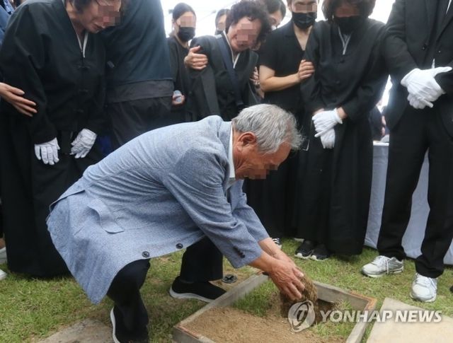 유족과 친지들은 슬퍼하며 채 상병의 영현을 흙으로 감싸 안아줬다. 한동안 흙으로 덮인 채 상병의 묘를 떠나지 못하고 어루만졌다.