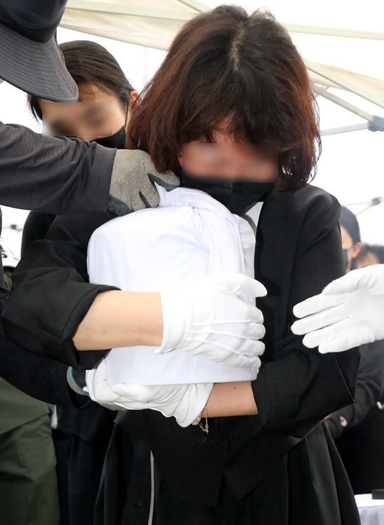 아들의 유골함을 꼭 끌어안고 놓지 못하는 어머니 / 이하 뉴스1
