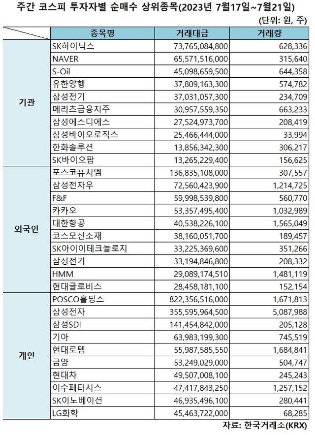 [표] 주간 코스피 기관·외인·개인 순매수 상위종목(7월17일~7월21일)