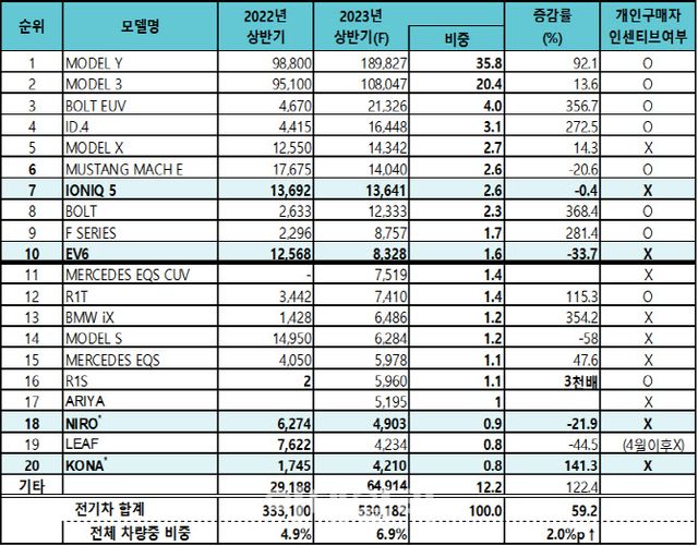 차종 모델별 판매 순위를 살펴보면 순수전기차(BEV)는 테슬라의 Model Y와 Model 3가 1, 2위를 차지하며 전체 BEV 판매량의 56%를 차지했다. 한국계 브랜드도 IRA 리스크에도 불구하고 IONIQ 5(현대차)와 EV6(기아)가 각각 판매 7위와 10위를 기록하며 베스트 TOP 10에 들어갔다.